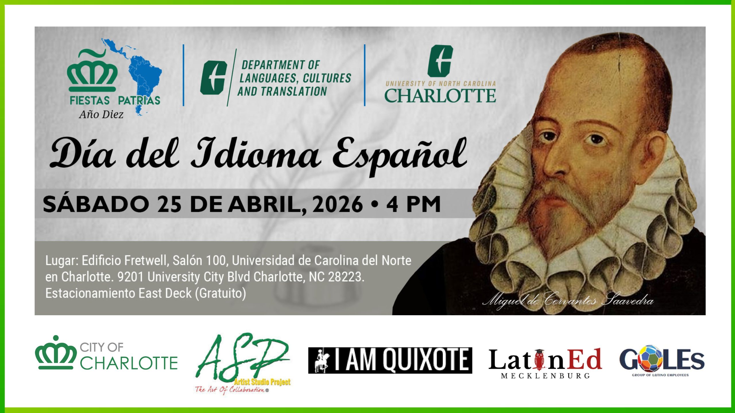 El Día del Idioma Español se llevará a cabo el sábado 25 de abril, a las 4 de la tarde, en el Edificio Fretwell, Salón 100 (Lyons Lecture Hall), de la Universidad de Carolina del Norte en Charlotte. La dirección de la entrada al campus es 9201 University City Blvd. Charlotte, NC 28223.
