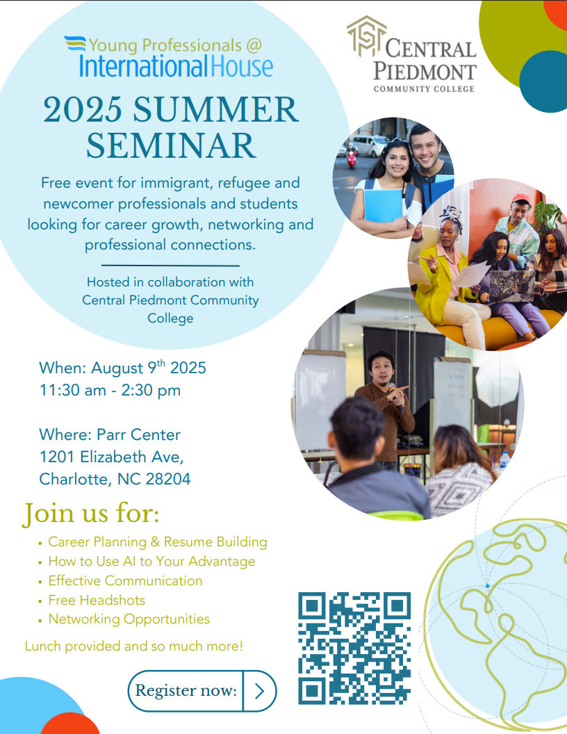 Our Young Professionals at International House are coordinating a ‘Summer Seminar Series’, designed as a one-day, mini-conference focused on professional development and networking. It’s going to be a 3-hour event, 11:30-2:30 on Saturday, August 9th. This unique event is being hosted in collaboration with Central Piedmont Community College and their Center for Global Engagement.